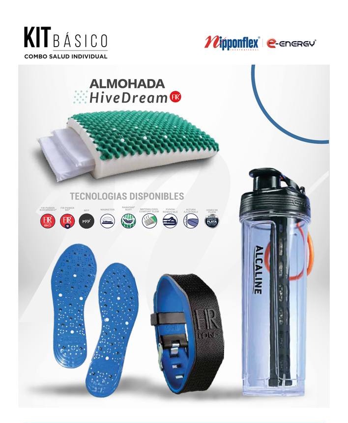 Combo de salud individual que incluye Almohada HiveDream, Plantillas, Bracelete FIR Ion y Squeeze Alcaline. Tecnología FIR, ION y alcalina.